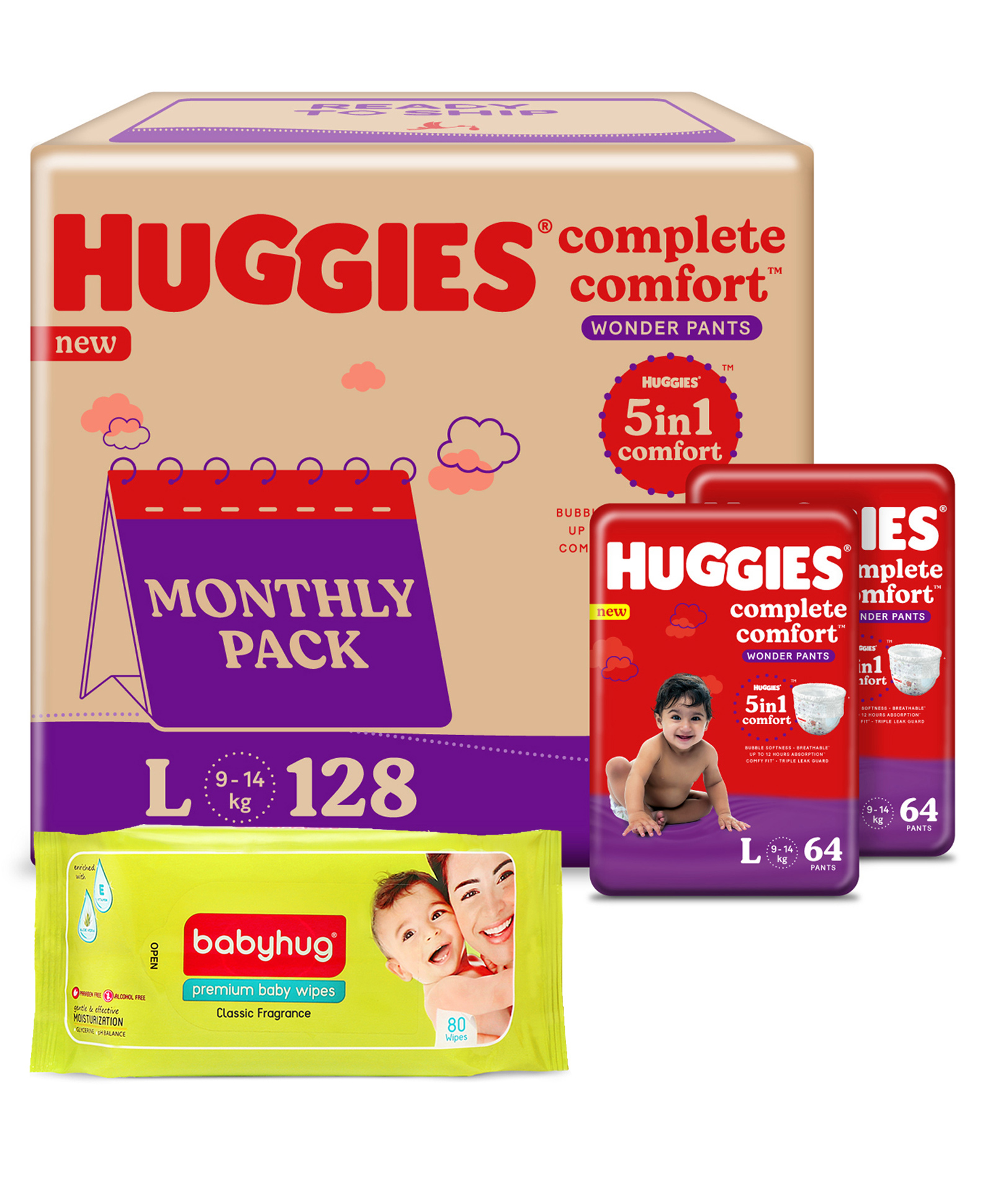 Huggies Wonder Pants Diaper Monthly Pack Large Size - 128 Pieces & Babyhug Premium Baby Wipes - 80 Pieces