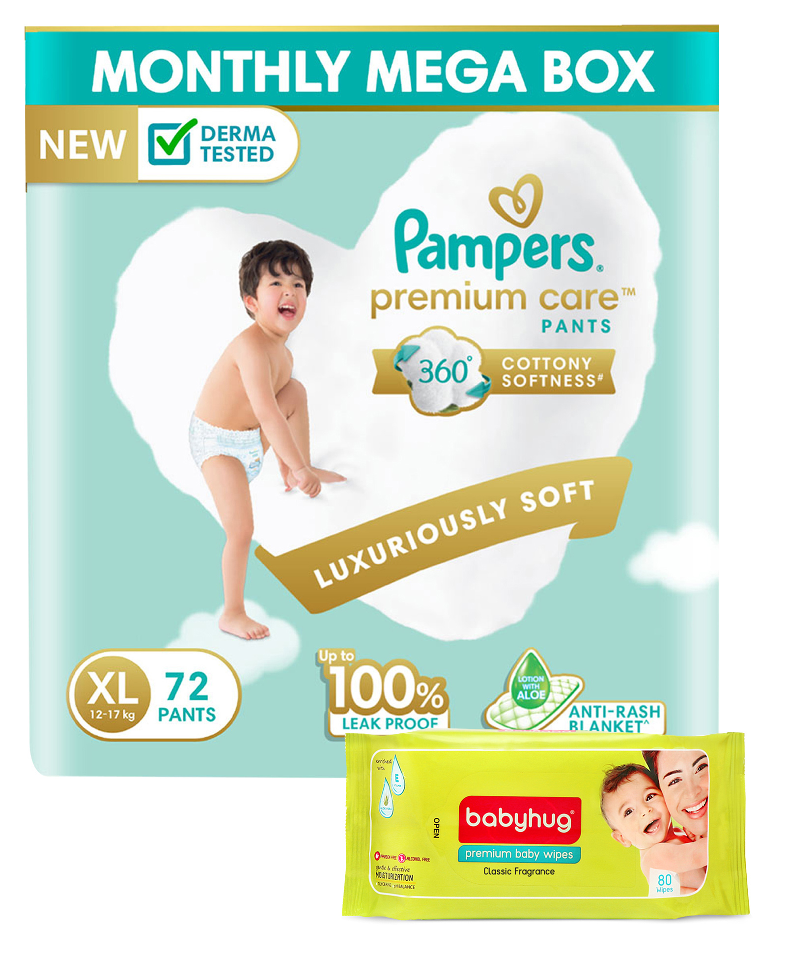 Pampers Premium Care Pant Style XL Size Diapers Monthly Pack - 72 Pieces & Babyhug Premium Baby Wipes - 80 Pieces