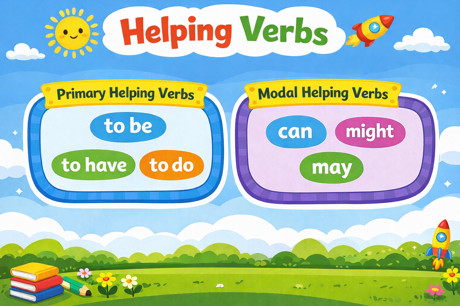 Although the helping verbs are limited in number, which is 23, they are used quite frequently. Here’s a concise list of helping verbs to help children and everyone keep them in mind easily.